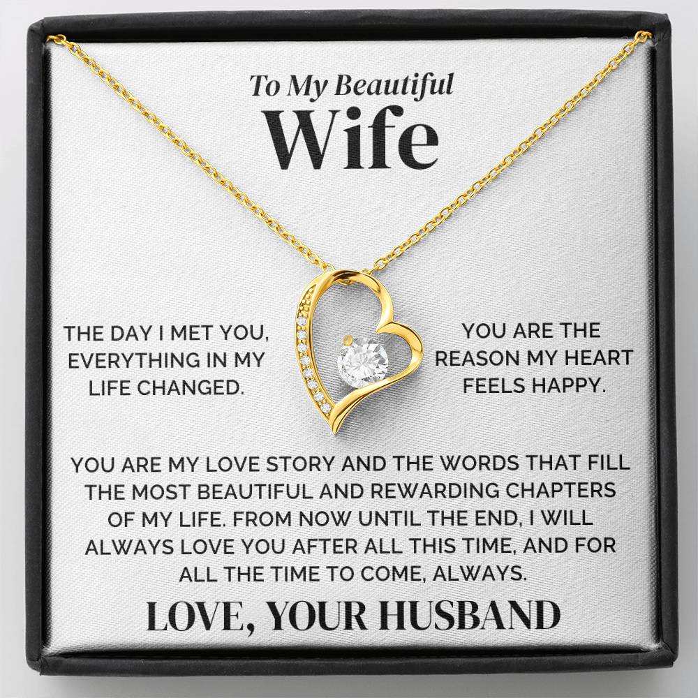 You are the reason my heart feels happy. You are my love story and the words that fill the most beautiful and rewarding chapters of my life. From now until the end, I will always love you After all this time, and for all the time to come, always." LOVE, YOUR HUSBAND"